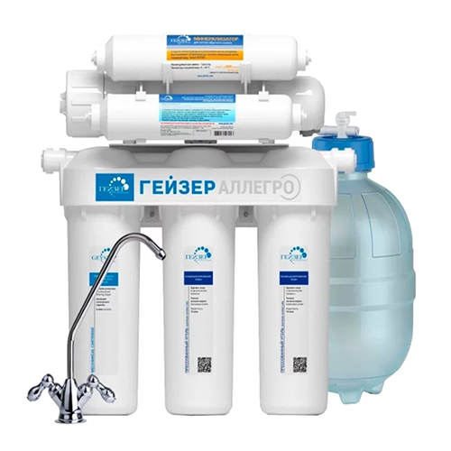 Фильтр Гейзер Аллегро М с минерализатором работает по принципу обратного осмоса. Фильтрация воды осуществляется через мембрану, поры которой пропускают только молекулы воды и кислорода. Размер молекул большинства примесей, а также бактерий и вирусов значительно больше молекул воды, поэтому они не проходят через мембрану.