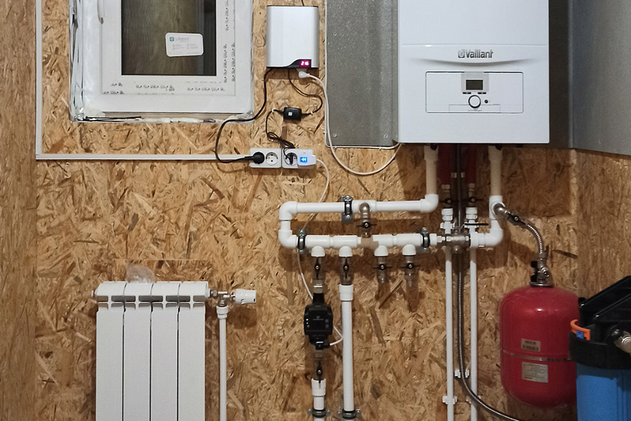 Котельная в доме 150 кв. м выполнена на базе турбированного двухконтурного газового котла Vaillant TurboTec Pro мощностью 24 кВт. Для управления работой котла используется отопительный контроллер Zont Smart 2.0, который в будущем позволит подключить погодазависимую автоматику и осуществлять ПИД-регулирование.