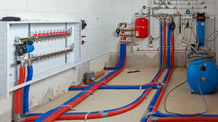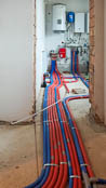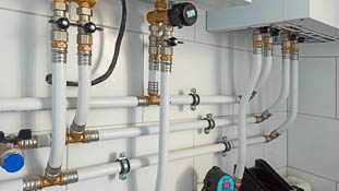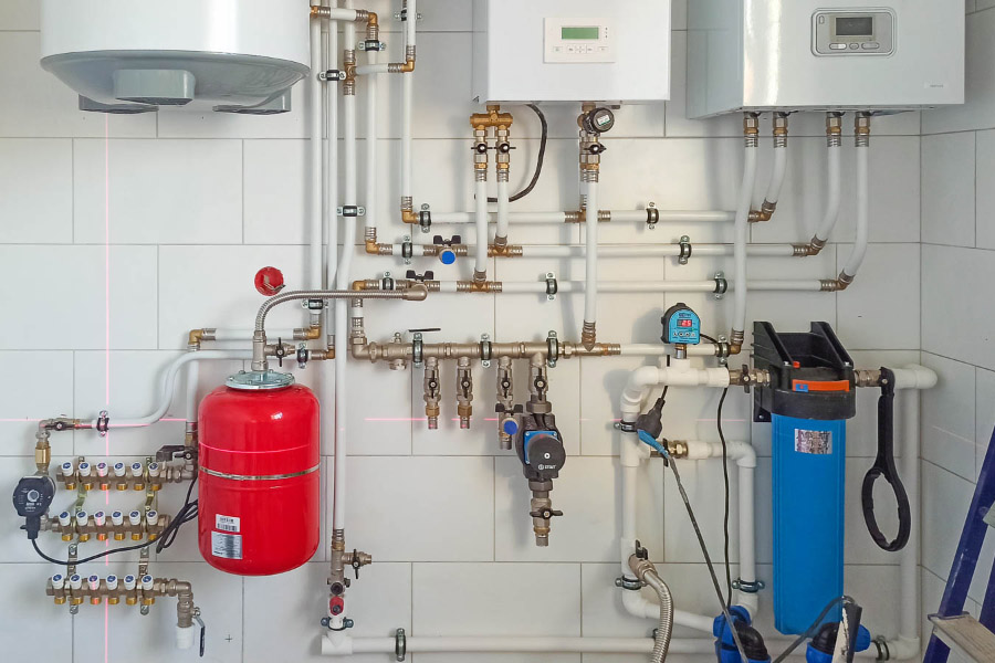 Разводка труб в котельной выполнена металлопластиковыми трубами Stout, монтаж на пресс-фитингах. Это создает дополнительную надежность системы, минимизирует возможные ошибки при монтаже. Кроме того, исключается диффузия кислорода в теплоноситель, что защищает систему отопления от излишней коррозии и продлевает срок службы ее элементов.