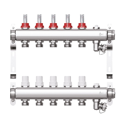 Коллектор предназначен для оптимизации и контроля распределения теплоносителя в системах радиаторного отопления и подогрева полов. Укомплектован кронштейнами для крепления в распределительном шкафу или на стене, заглушками, воздухоотводчиками для удаления кислорода и дренажными кранами для операций заполнения/слива системы.