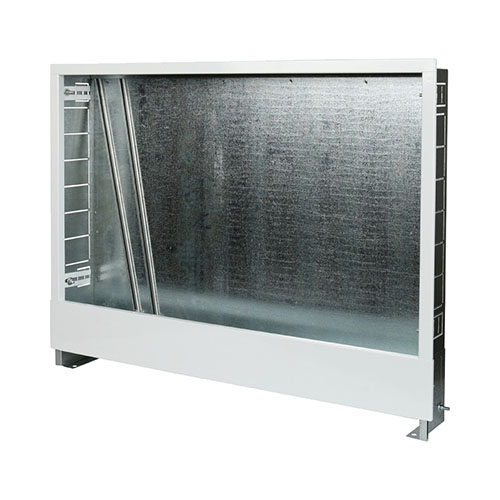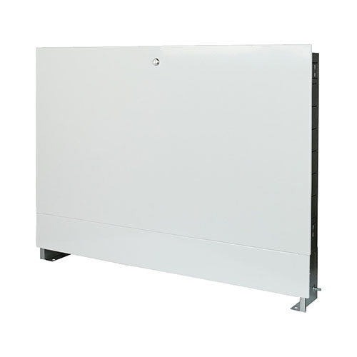 Распределительный встроенный шкаф предназначен для удобного размещения распределительных коллекторов радиаторной, напольной разводки, водопровода. Изготовлен из оцинкованной стали, лицевые поверхности окрашены порошковой эмалью с предварительным нанесением фосфатной пленки. В боковых стенках корпуса выполнена перфорация, сегменты которой удаляются в месте, удобном для пропуска присоединительных трубопроводов. Универсальные крепления внутри шкафа позволяют распределить оборудование максимально эргономичным способом. Регулировка по высоте до 90 мм с помощью выдвижных ножек. Регулировка по глубине до 70 мм с помощью выдвижной рамки. Ножки оборудованы отверстиями для крепления к полу. Отгибные фиксаторы помогают закрепить шкаф в стенной нише.