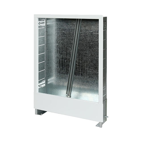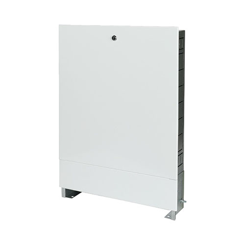 Распределительный встроенный шкаф предназначен для удобного размещения распределительных коллекторов радиаторной, напольной разводки, водопровода. Изготовлен из оцинкованной стали, лицевые поверхности окрашены порошковой эмалью с предварительным нанесением фосфатной пленки. В боковых стенках корпуса выполнена перфорация, сегменты которой удаляются в месте, удобном для пропуска присоединительных трубопроводов. Универсальные крепления внутри шкафа позволяют распределить оборудование максимально эргономичным способом. Регулировка по высоте до 90 мм с помощью выдвижных ножек. Регулировка по глубине до 70 мм с помощью выдвижной рамки. Ножки оборудованы отверстиями для крепления к полу. Отгибные фиксаторы помогают закрепить шкаф в стенной нише.