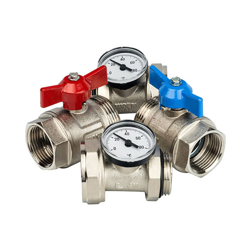 Главная страница Каталог товаров Арматура для котельной Коллекторы для теплого пола Stout Комплект прямых шаровых кранов с термометрами Stout 1" — купить в Ярославле