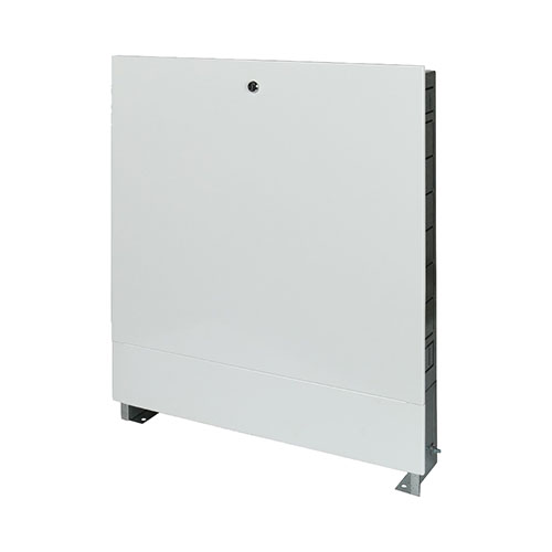 Распределительный встроенный шкаф предназначен для удобного размещения распределительных коллекторов радиаторной, напольной разводки, водопровода. Изготовлен из оцинкованной стали, лицевые поверхности окрашены порошковой эмалью с предварительным нанесением фосфатной пленки. В боковых стенках корпуса выполнена перфорация, сегменты которой удаляются в месте, удобном для пропуска присоединительных трубопроводов. Универсальные крепления внутри шкафа позволяют распределить оборудование максимально эргономичным способом. Регулировка по высоте до 90 мм с помощью выдвижных ножек. Регулировка по глубине до 70 мм с помощью выдвижной рамки. Ножки оборудованы отверстиями для крепления к полу. Отгибные фиксаторы помогают закрепить шкаф в стенной нише.