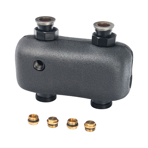 Гидравлическая стрелка для закрытых систем отопления. Обеспечивает защиту систему от воздействия насосов-потребителей тепла на котловые насосы и наоборот. В качестве теплоносителя может использоваться вода или гликоль до 30%. Корпус и штуцеры выполнены из стали, гайки - из латуни, теплоизоляционный кожух - из пенополиуретана высокой плотности.