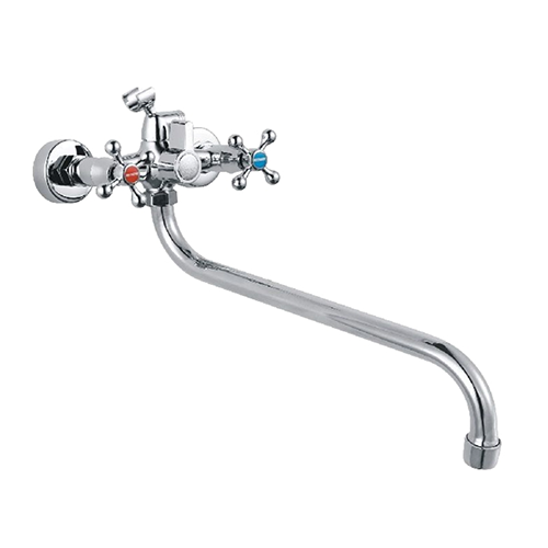 Двухвентильный смеситель для ванны с длинным поворотным изливом. Аэратор отфильтровывает разнообразные примеси и обеспечивает равномерный поток и смягчение воды. Оснащен качественной керамической кран-буксой.