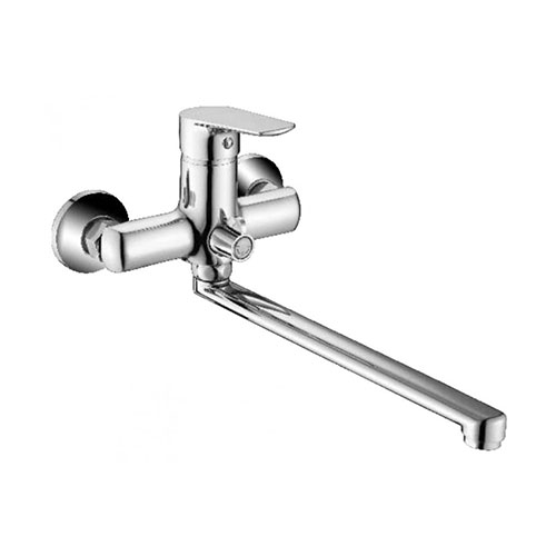 Однорычажный смеситель для ванны с длинным поворотным изливом. Аэратор отфильтровывает разнообразные примеси и обеспечивает равномерный поток и смягчение воды.