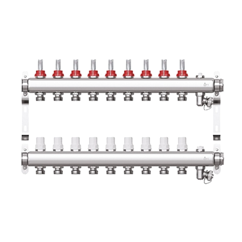 Коллектор предназначен для оптимизации и контроля распределения теплоносителя в системах радиаторного отопления и подогрева полов. Укомплектован кронштейнами для крепления в распределительном шкафу или на стене, заглушками, воздухоотводчиками для удаления кислорода и дренажными кранами для операций заполнения/слива системы.