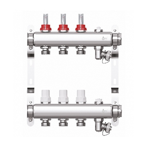 Главная страница Каталог товаров Арматура для котельной Коллекторы для теплого пола STI Коллектор STI с расходомерами 1"x 3 выходами, Евроконус 3/4 нержавеющая сталь — купить в Ярославле