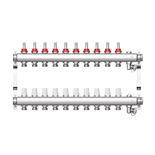 Коллектор предназначен для оптимизации и контроля распределения теплоносителя в системах радиаторного отопления и подогрева полов. Укомплектован кронштейнами для крепления в распределительном шкафу или на стене, заглушками, воздухоотводчиками для удаления кислорода и дренажными кранами для операций заполнения/слива системы.