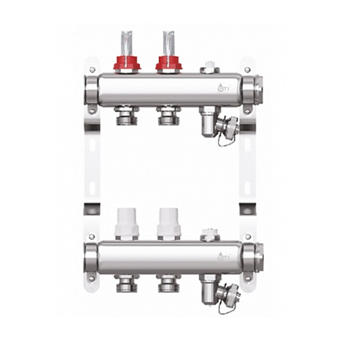 Коллектор предназначен для оптимизации и контроля распределения теплоносителя в системах радиаторного отопления и подогрева полов. Укомплектован кронштейнами для крепления в распределительном шкафу или на стене, заглушками, воздухоотводчиками для удаления кислорода и дренажными кранами для операций заполнения/слива системы.