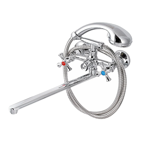 Двухвентильный смеситель для ванной с многофункциональной массажной лейкой и плоским изливом. Изготовлен из высококачественной латуни с последующим хромированием, что обеспечивает долгий срок службы. Переключение ванна-душ осуществляется с помощью удобной кран-буксы.