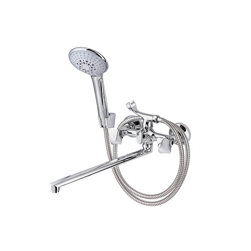 Двухвентильный смеситель для ванной с многофункциональной массажной лейкой и плоским изливом. В качестве переключения ванна-душ используется кран-букса. Для перенаправления потока воды с излива смесителя на душевую систему и наоборот предусмотрен поворотный дивертор.