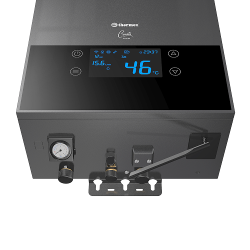 Электрический настенный котел для отопления помещений площадью до 120 кв.м. Оснащен объемным расширительным баком, усиленным ТЭНом и теплообменником из нержавеющей стали, системой защиты от замерзания, блокировкой панели управления от вмешательства детей и системой самодиагностики. Тиристорная регулировка мощности обеспечивает более точное управление. Встроенная технология Wi-Fi Motion позволяет управлять котлом дистанционно с помощью приложения Thermex Home (контролировать корректность работы котла, настраивать алгоритмы нагрева, температуру и многое другое). Котел может обеспечить нагрев системы ГВС при подключении трехходового клапана. Возможно подключение проводного или беспроводного термостата для получения данных по температуре в помещении.