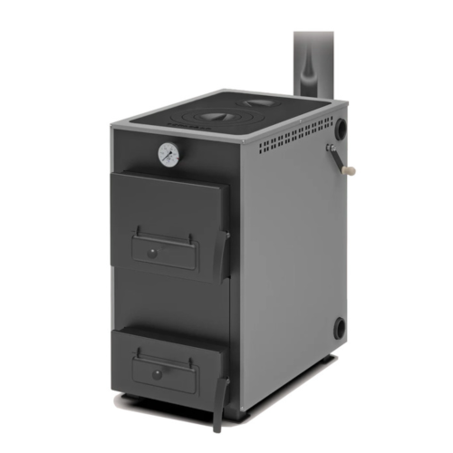 Экономичный надежный твердотопливный котел мощностью 10 кВт предназначен для отопления помещений площадью до 100 кв.м. Длительность горения на одной закладке угля достигает 5 часов. Может работать как в закрытых, так и в открытых системах отопления с принудительной циркуляцией теплоносителя. Может использоваться и как самостоятельный источник тепловой энергии в качестве дополнения к существующим системам отопления с газовыми, жидкотопливными или электрическими котлами. Оснащен глубокой наклонной топкой для использования длинных дров и равномерного распределения угля по всей глубине топки при засыпке, чугунным водонаполненным колосником, вместительным ящиком зольника, термометром для контроля температуры теплоносителя. Защитный кожух-конвектор с конвекционными отверстиями обеспечивает дополнительный обогрев помещения, в котором установлен котел. Имеется возможность установки автоматического регулятора тяги для управления интенсивностью горения.
